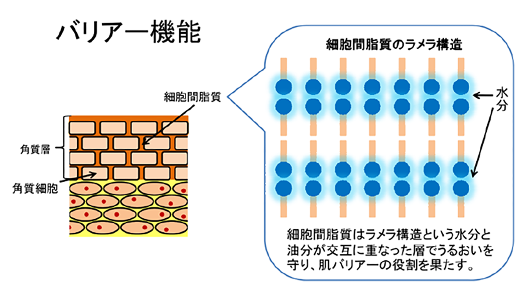細胞間脂質は、ラメラ構造という水分と油分が交互に重なった層でうるおいを守り、肌のバリア機能をはたします。うるおいが低下した肌は様々なトラブルが起こりやすくなるため、健康的な肌に近いラメラ構造を持つ成分の化粧品をつかうことで、自然なうるおいのまま、一日を過ごすことが可能になります。
