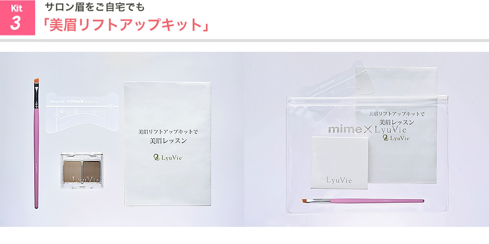 ふんわりとナチュラルで美しい眉を作るのにマストアイテムのパウダーとブラシ、そしてリフトアップ効果のある眉アーチが作れる美眉プレートに加え、詳しいマニュアルもついた美眉キット。
